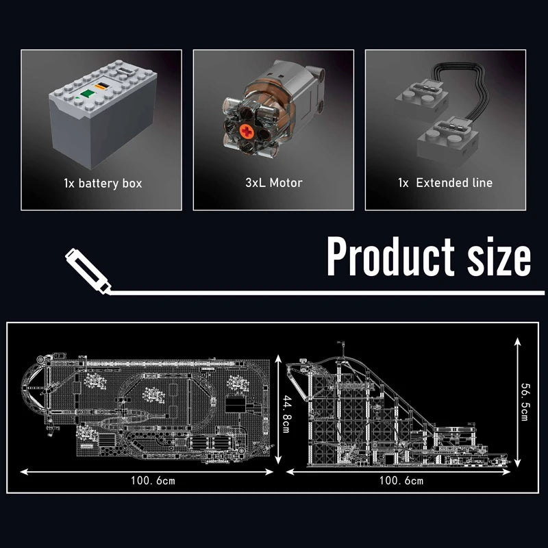 Erlebe Nervenkitzel pur direkt bei dir zuhause! Mit diesem beeindruckenden Achterbahn-Bauset aus 3646 Teilen baust du ein riesiges, detailreiches Modell, das nicht nur durch seine Größe, sondern auch durch seine funktionierende Motorisierung begeistert.