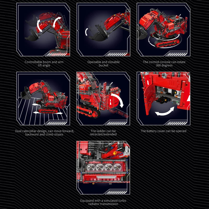 Dieser gigantische Kettenbagger besteht aus 4767 Teilen und ist mit mehreren Elektromotoren ausgestattet. So lassen sich Ketten, Schaufel und Ausleger realistisch bewegen – für ein echtes Technik-Erlebnis. Mit seiner roten Bauweise, vielen Details und der massiven Größe ist dieses Modell ein absolutes Highlight für Technik- und Baumaschinen-Fans.